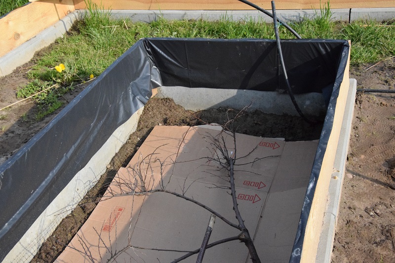 A teraz etapy wypełniania skrzyni. Najpierw zdjęliśmy wierzchnią warstwę żyznej ziemi, pogłębiając skrzynię o sztych. Ziemia ta zostanie później wykorzystana do wypełnienia. Żeby skrzynie nie stały się stołówką dla kretów i myszy na dno położyliśmy siatkę drobnooczkową. Na siatkę zgodnie z zasadami permakultury położone zostały szare kartony.