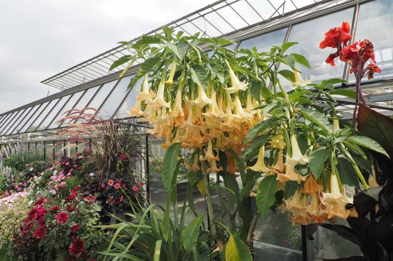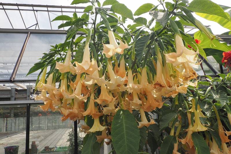 Brugmansie – rośliny wieloletnie, najczęściej możemy spotkać szerokie krzewy . W naszym klimacie najczęściej spotykamy rośliny osiągające wysokość do 2m w ojczyźnie osiągają 4-10 m