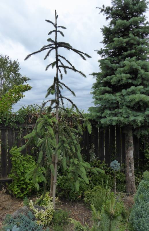 Picea abies (świerk pospolity) 'Inversa' - trzeba podwiązywać przewodnik
