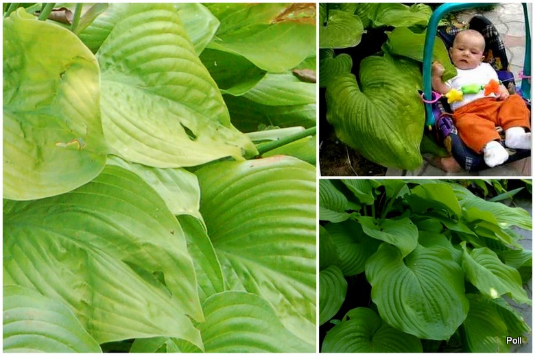 Pierwsze jej zdjęcie, jakie mam , to fotka z moja wnuczka Jagusia, która w styczniu skończyła 9 lat :woohoo: :woohoo: Ustawiłam fotelik, aby było widać, jak wielkie mogą być liście tej hosty.