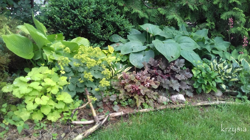 i zdjęcie wczorajsze, z prawej dorosła So Sweet, a pod nią, w prawym dolnym rogu Enduring Beacon, w ubiegłym roku jeszcze nie była przykryta liśćmi S&S, która jak widać liście ma żółte, dostaje sporo słońca .