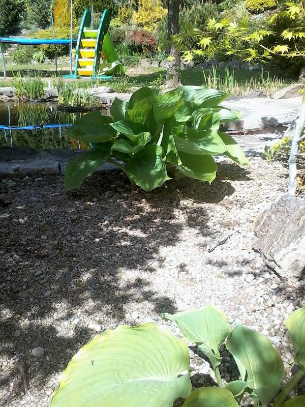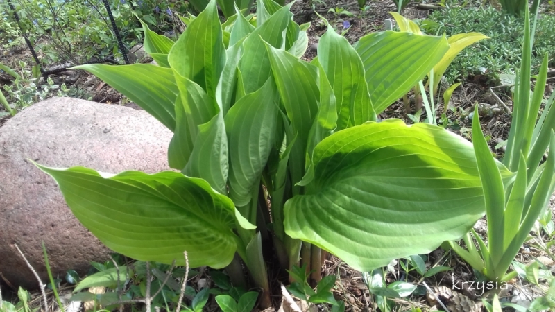 Hosta Sum and Substance u mnie także ruszyła, nieco wolniej od swoich wszystkich dzieci. Ziemia na wysepce jest chłodzona wodą oczka i chyba to jest przyczyna wolniejszego rozwoju