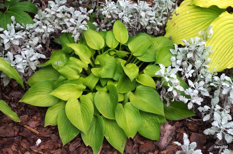 Rozmiar:S/M wysokość 25-30cm Liście: zielone, w kształcie serca, w trakcie sezonu zmieniają barwę na złocistą Kwiaty: lawendowe w czerwcu/lipcu Zalecane stanowisko: od słońca do cienia