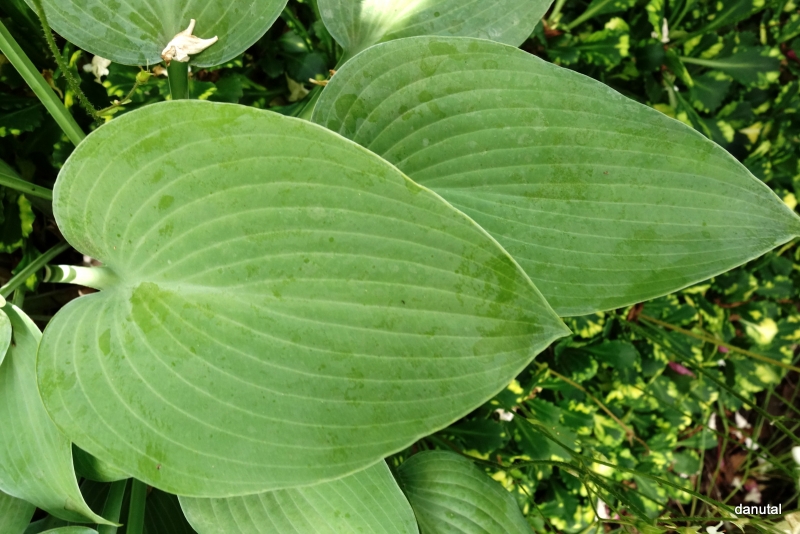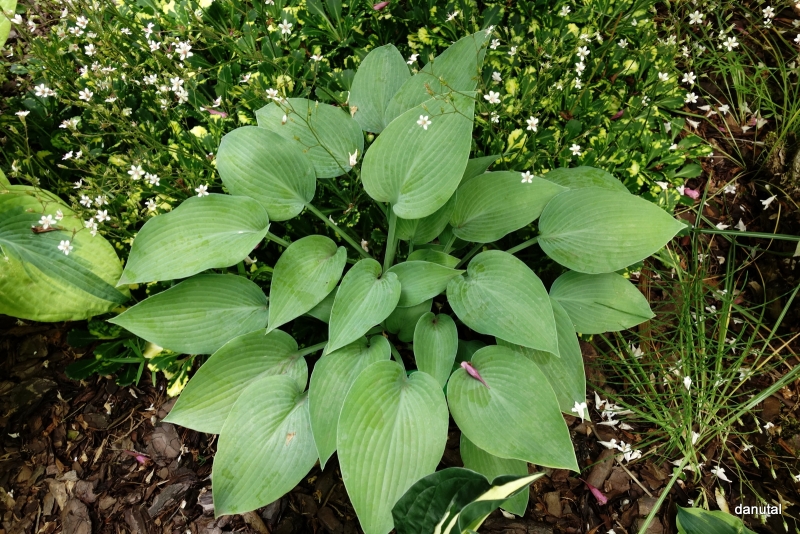 Rozmiar: M wysokość 35-40cm Liście: sztywne,sercowate niebiesko-zielone, na bardziej nasłonecznionych stanowiskach zmieniają się na żółtawo-białe Kwiaty: lawendowe Zalecane stanowisko: półcień/cień Uwagi: