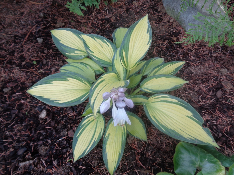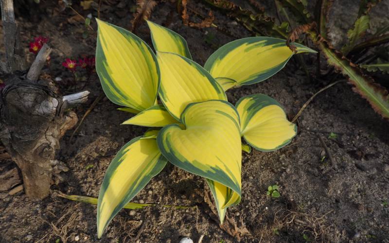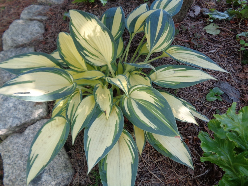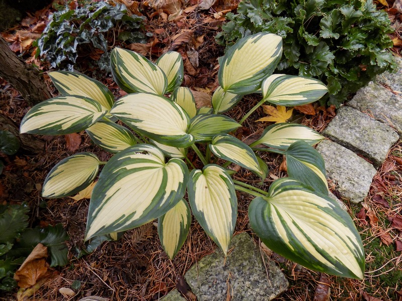 Liście: sztywne,w kształcie serca; kremowo-białe z niebiesko-zielonym marginesem