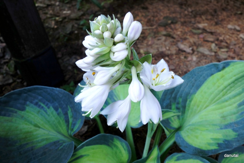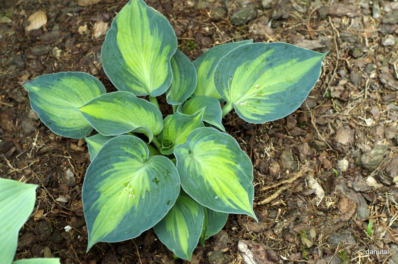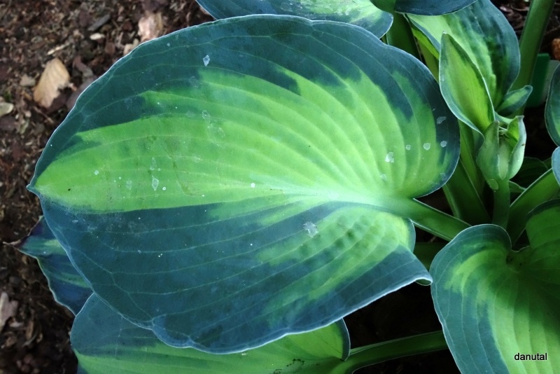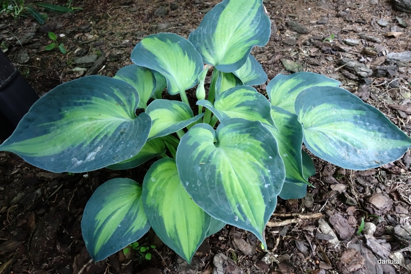 Rozmiar: M wysokość 40-45cm Liście: owalne,grube, w kształcie serca niebiesko-zielone z żółtym centrum Kwiaty: blado lawendowe Zalecane stanowisko: półcień/cień