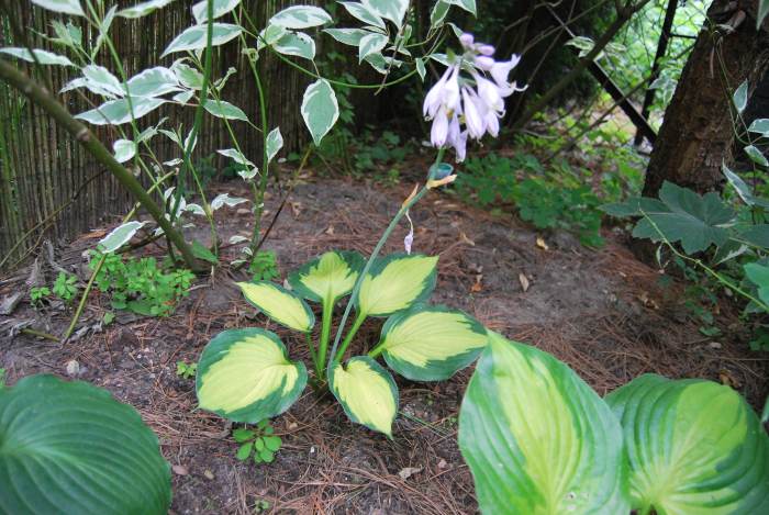 Jedna z kęp hosty Captain Kirk na wilgotnym stanowisku jakoś nierówno się rozwija.