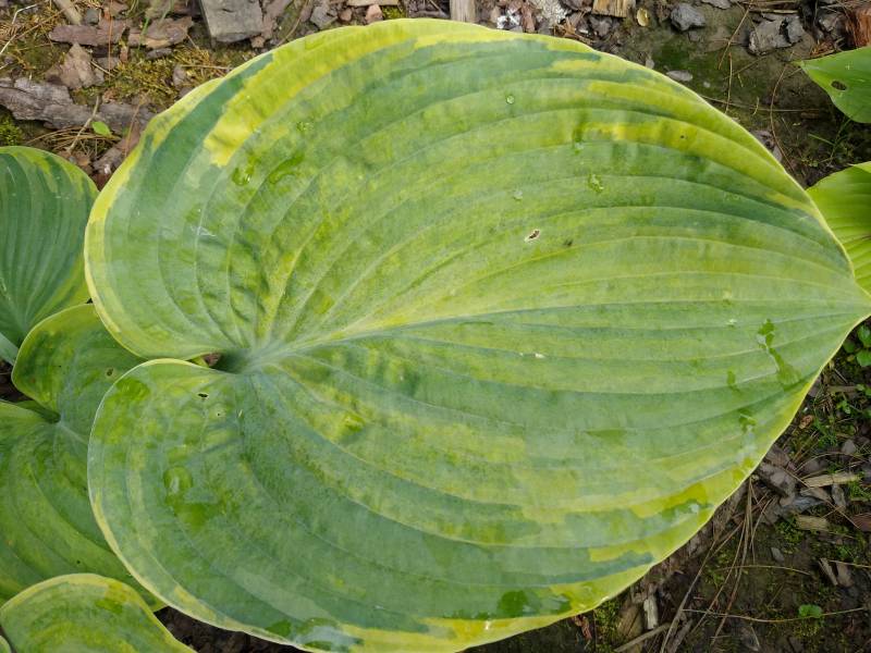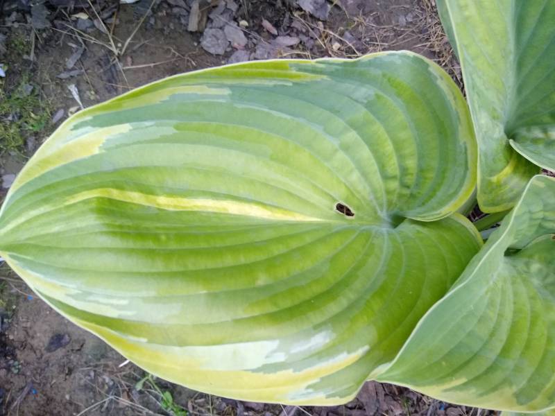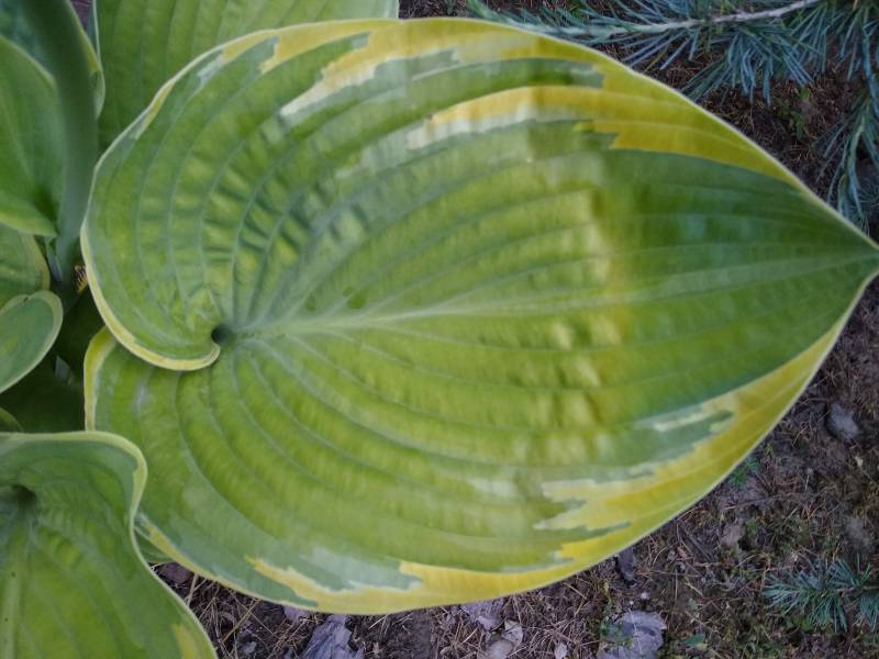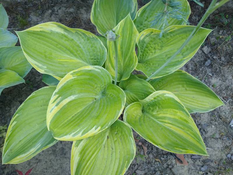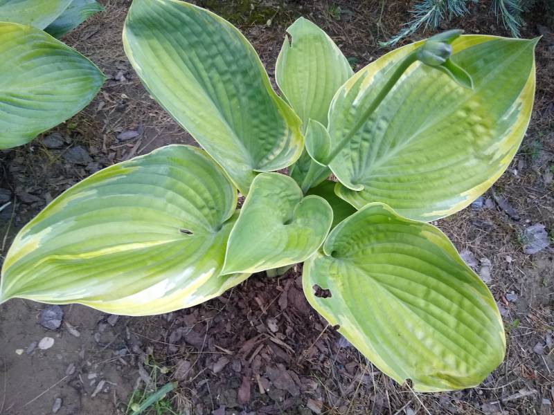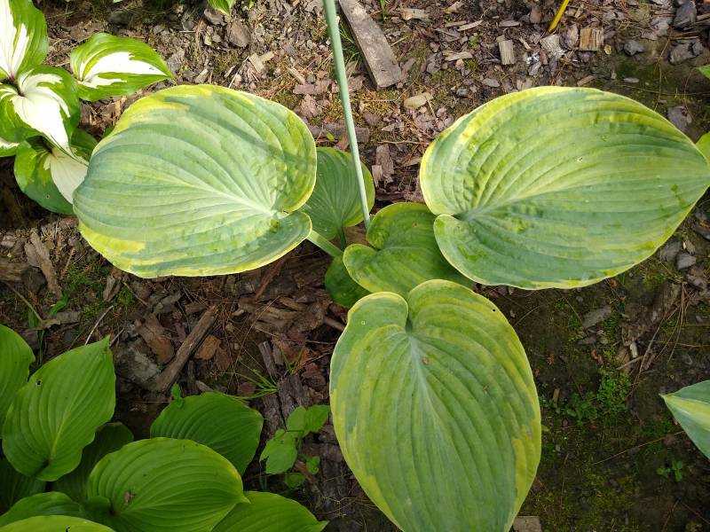 Wielkość L wys.70 cm. szer. 100 cm. Liście - zielono niebieskie z żółto kremowym marginesem Kwiaty - prawie białe Wzrost - średni Stanowisko - cień ,półcień