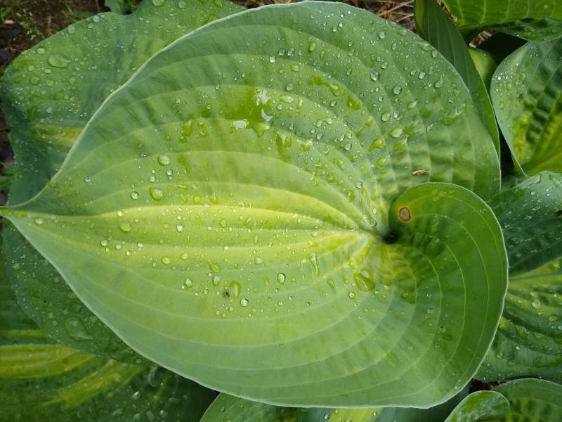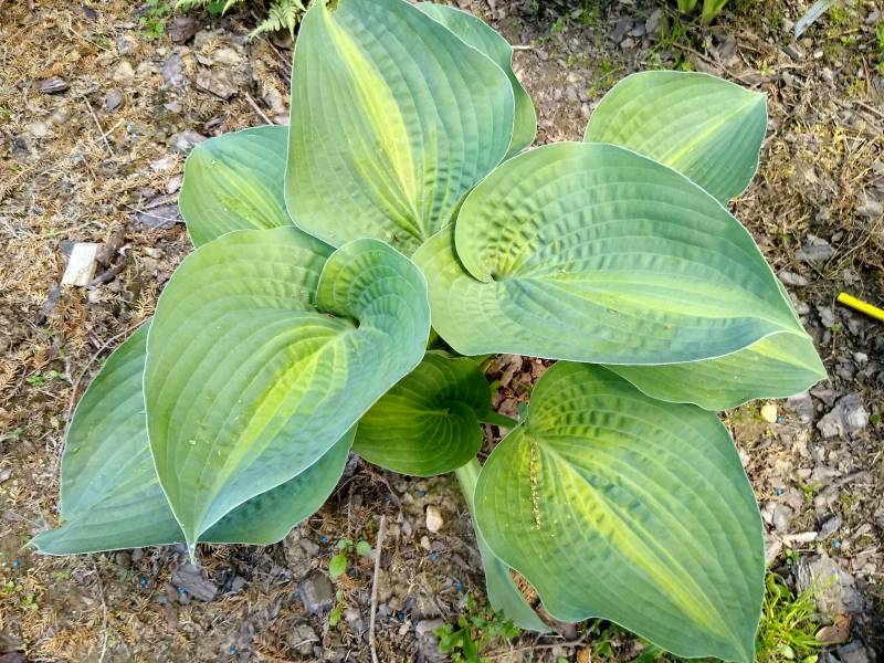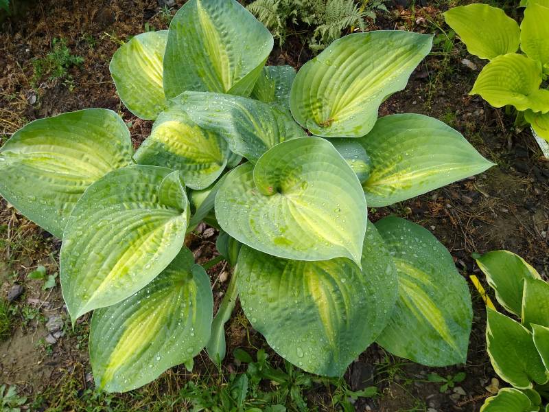 Wielkość L (60- 70 cm ) Liście - grube , zielono niebieskie , z wąskim , żółto zielonym środkiem Kwiaty - lawendowe Wzrost - średni Stanowisko - od słońca do cienia