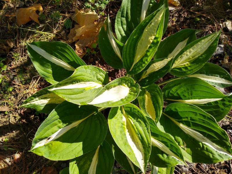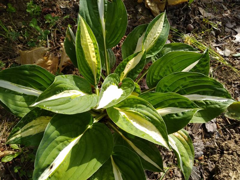Wielkość - M ( 50 - 60 cm.) Liście - pojawiają się wcześnie , niebieska poświata zanika i robią się zielone , wiosną środek liścia jest biały , później zielenieje Kwiaty - lawendowe Wzrost - dobry Stanowisko - cień , półcień