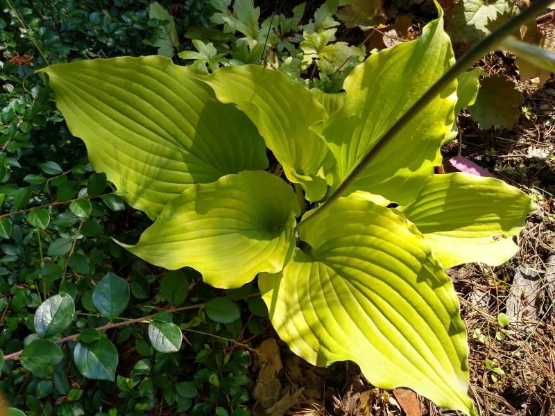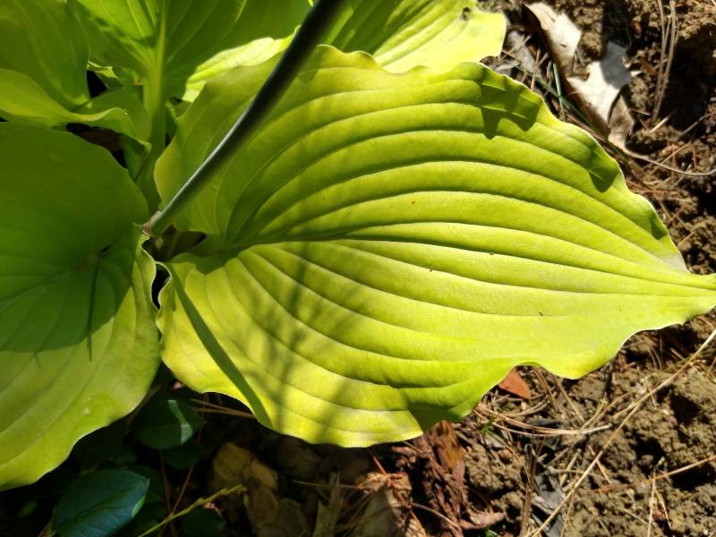 Wielkość M (40 - 45 cm) Liście - żółtozielone z pofalowanym brzegiem , widoczne żyłkowanie Kwiaty - lawendowe Wzrost - średni Stanowisko - cień ,półcień