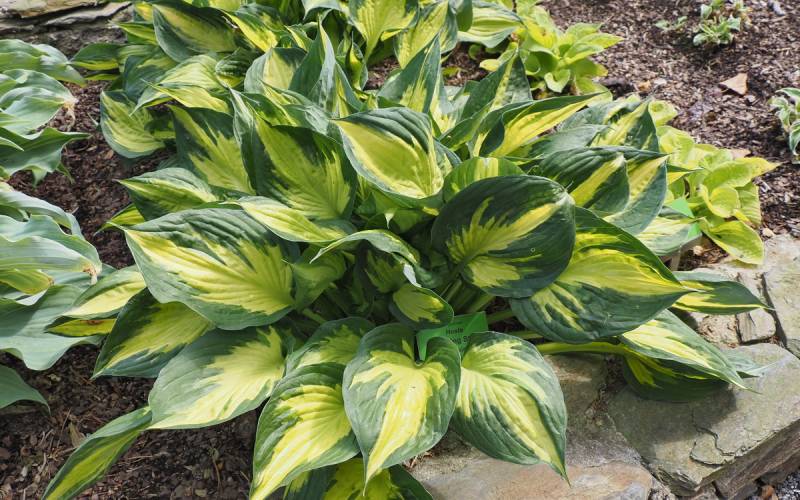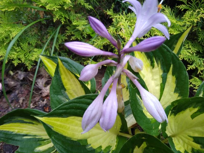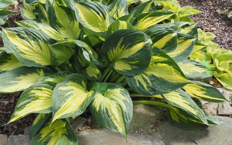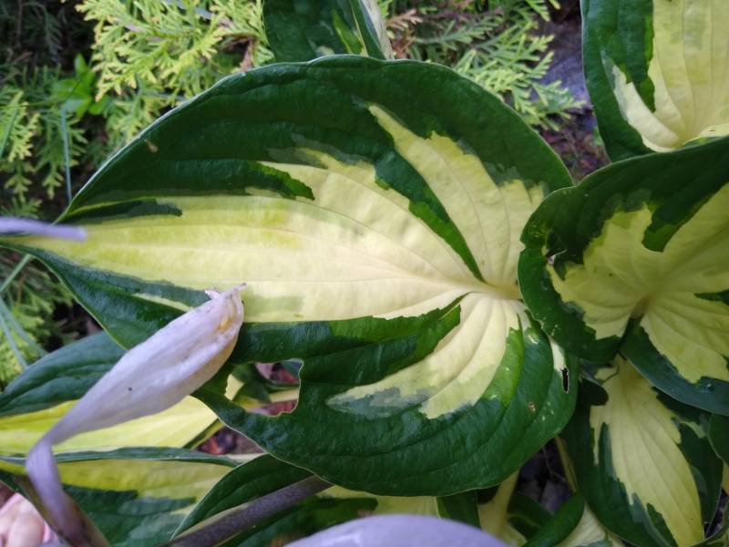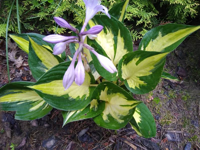 Wielkość M (wysokość 40-45 cm.) Liście - grube , ciemnozielone , z kremowo białym środkiem Kwiaty - liliowe Stanowisko - cień , półcień Wzrost - średni
