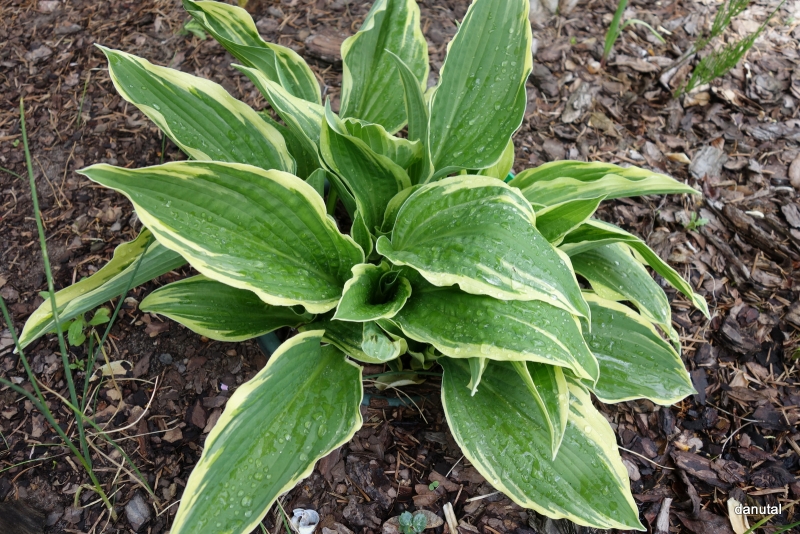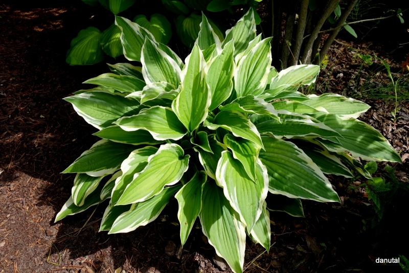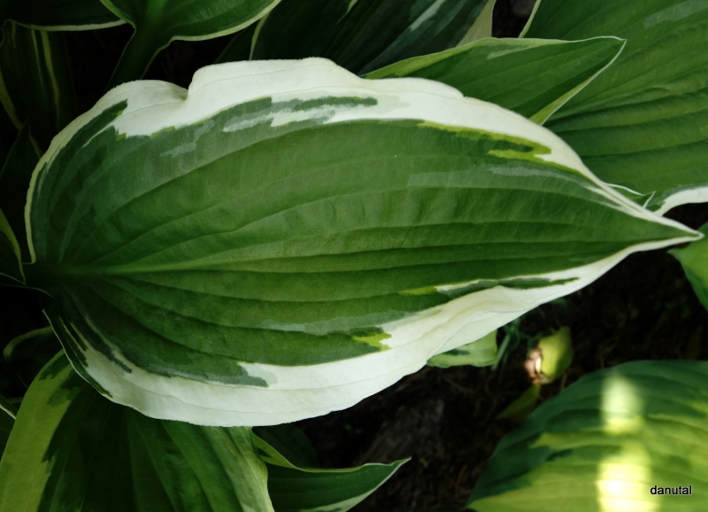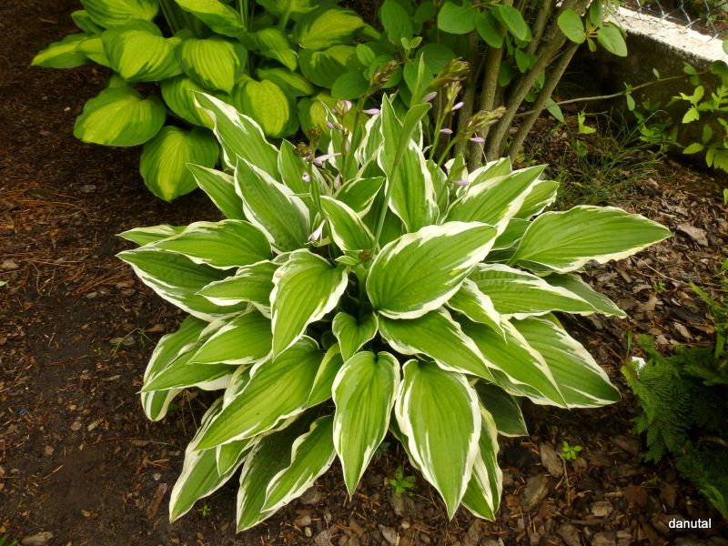 Rozmiar: M wysokośc 45-50cm Liście: sercowate zielone liście z kremowo-białym pofalowanym marginesem i wyraźnym unerwieniem Kwiaty: lawendowe, kwitną w lipcu Zalecane stanowisko: od słońca do cienia