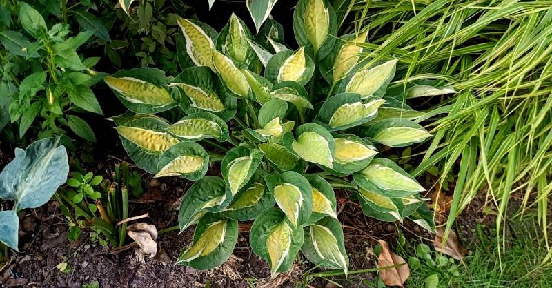 Liście: okrągłe, zakończone ostrym wierzchołkiem... jasnozielone do żółtego centrum, otoczone ciemniejszym marginesem, które rozdzielają charakterystyczne, białe smugi... w trakcie sezonu wybarwienie ulega zmianom... słabszej substancji