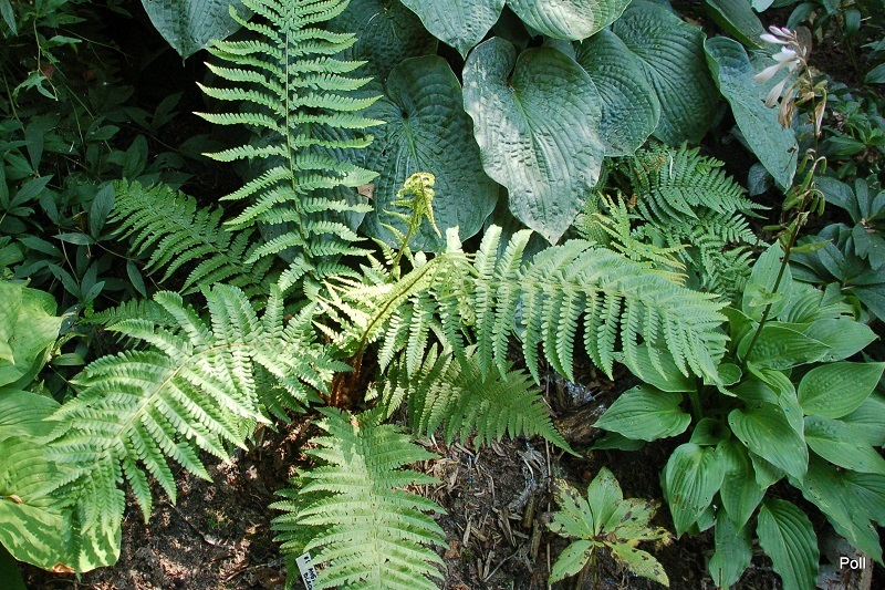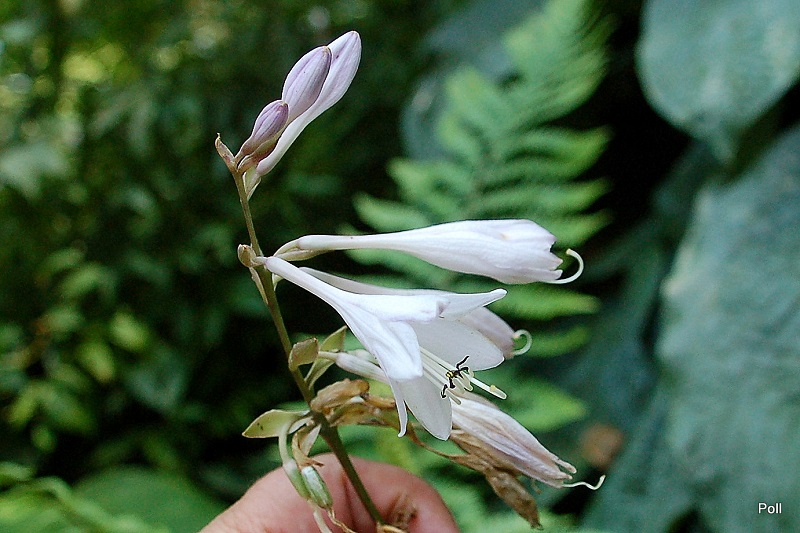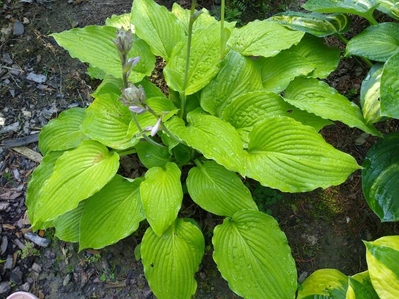 Wielkość M ( wysokość 55-60 cm) Liście - zielone z naciekami 'mottled' jaśniejszego koloru , lekko falowane Kwiaty - jasno lawendowe, delikatne, od początku lipca wzrost - średni Stanowisko - cień , półcień