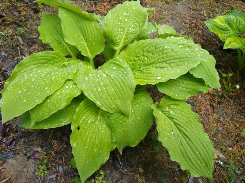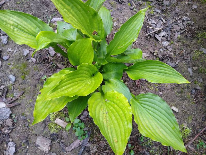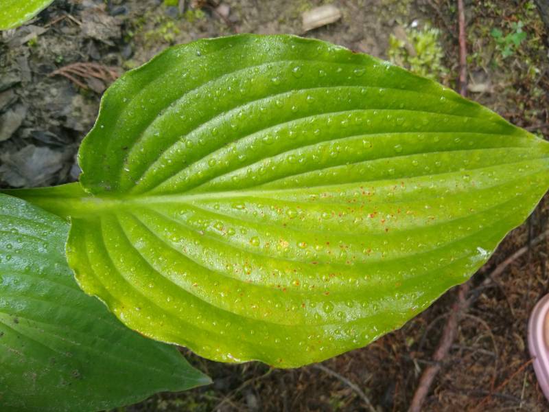 Dorosła Hanjas Falls ma mieć wiosną wyraźne jaśniejsze przebarwienia na całej blaszczce liściowej. Są to raczej ślady mottled, niż streaked i niezbyt mocno rzucające się w oczy. Ja tych przebarwień u swojej hosty nie widziałam- albo jest za młoda, albo ma wiosną zbyt ciemne stanowisko.