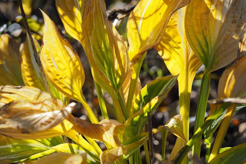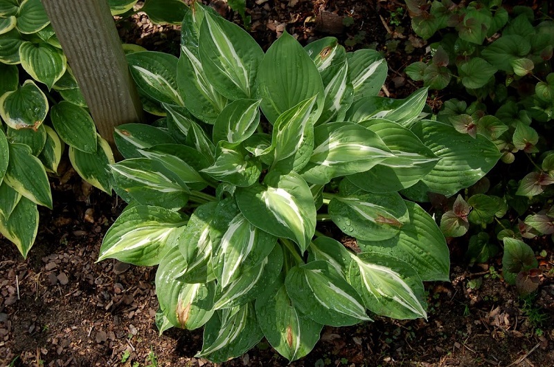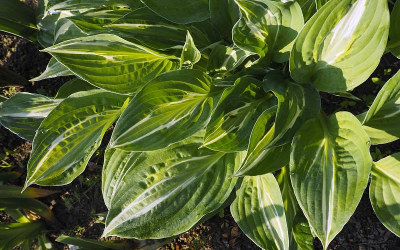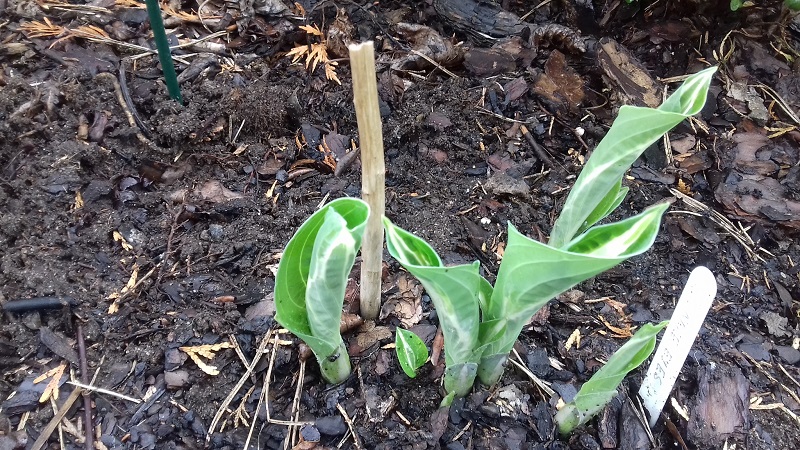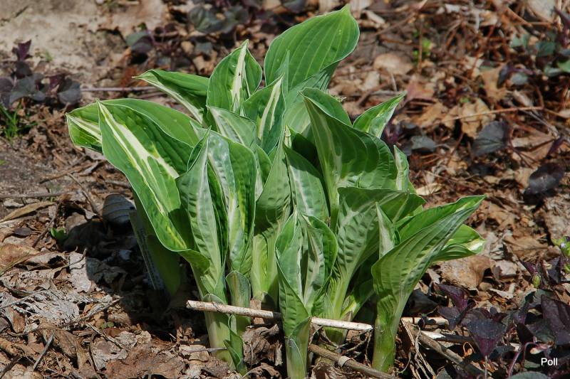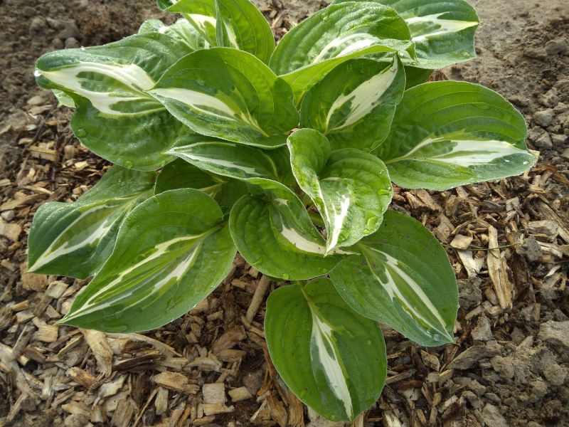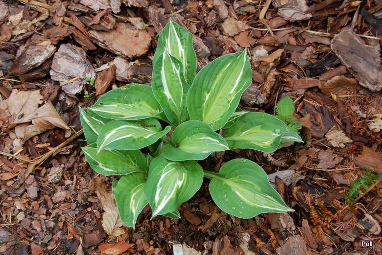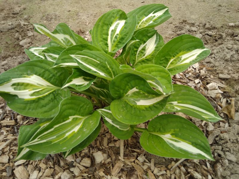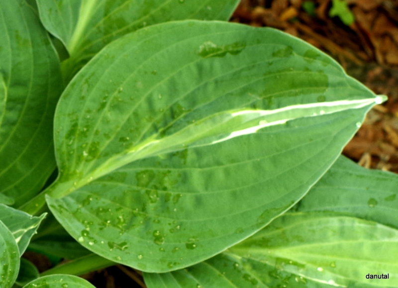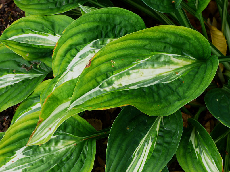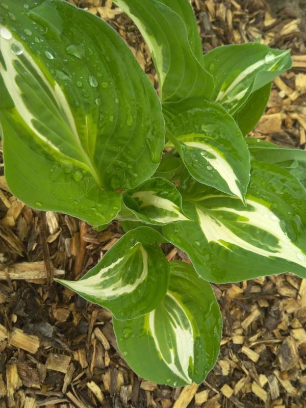Liście: sercowate, o wymiarach 18 x 13 cm, ostro zakończone; jaśniejsze(najpierw zielone, potem zmienia się niemal w kremowe) centrum otoczone zielonym marginesem, który oddzielony jest od niego białą nitką
