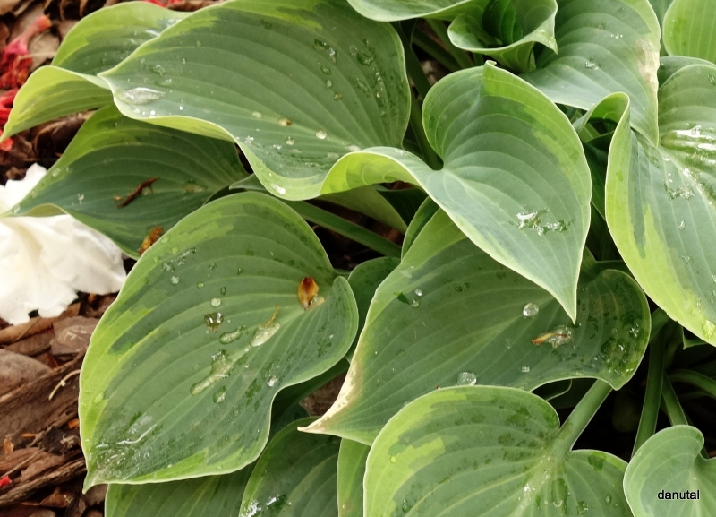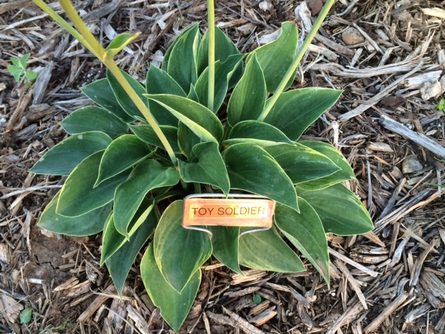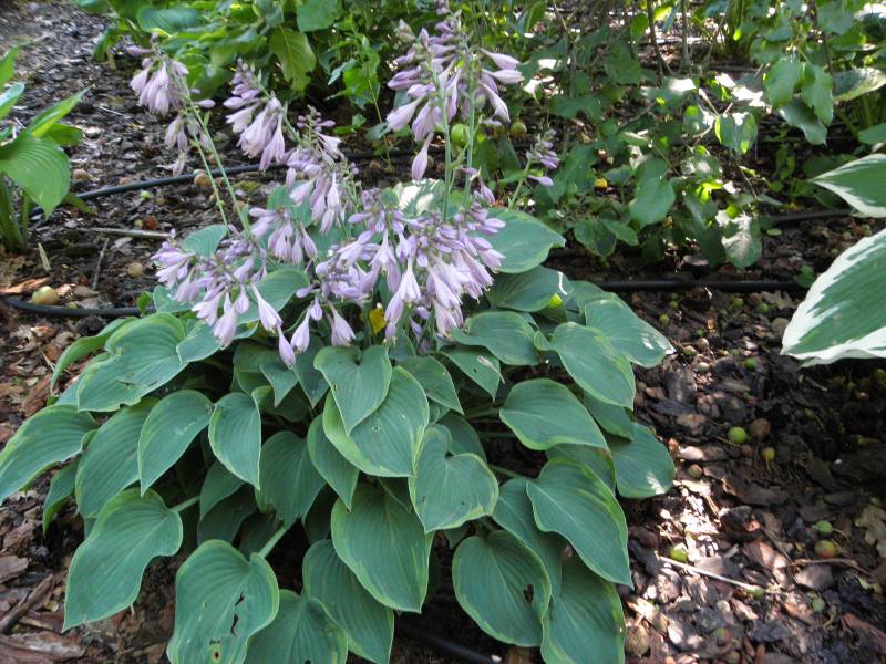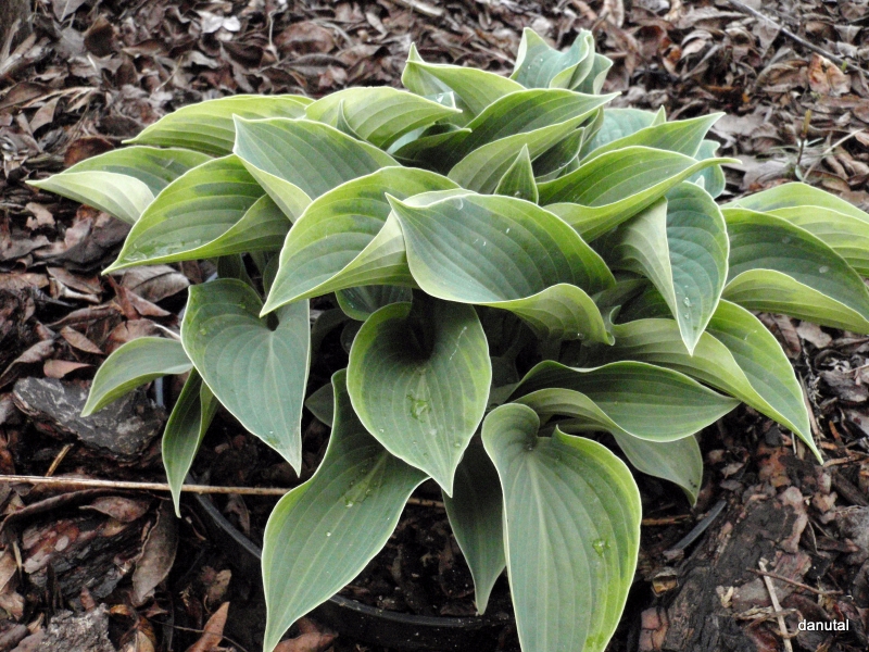 Rozmiar: S/M wysokość 30-35cm Liście: zaokrąglone niebiesko-zielone liście z zielonkawo-żółtym marginesem Kwiaty: lawendowe w czerwcu Zalecane stanowisko: zarówno w słońcu i cieniu Uwagi: