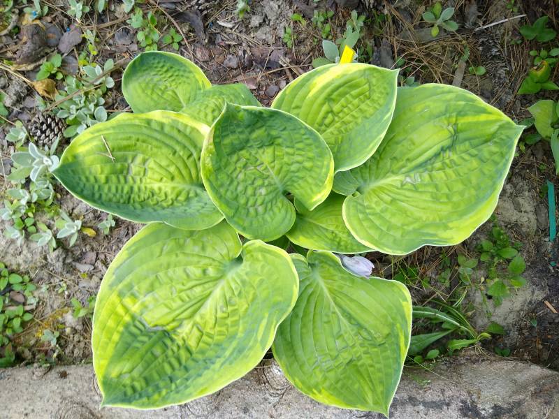 Wielkość M ( 40-45 cm) Liście - butelkowa zieleń z kremowo-żółtym brzegiem , miseczkowate , ciężkie i pomarszczone Kwiaty - lawendowe Wzrost -przeciętny Stanowisko - cień , półcień