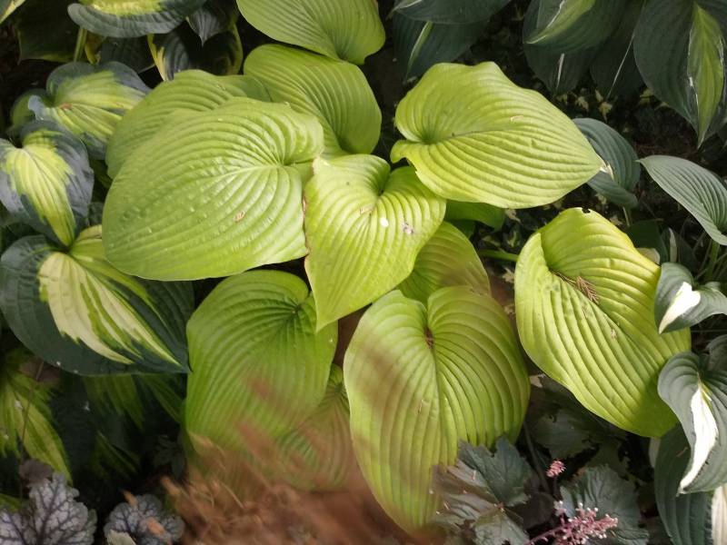 Wielkość L ( 70 cm wys. x 140 cm szer.) Liście - jasnozłote, wzniesione, sercowate, dobrej substancji Kwiaty - prawie białe Stanowisko - od słońca do cienia Wzrost - średni