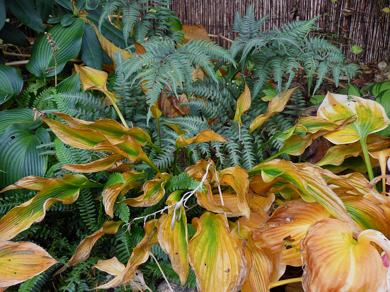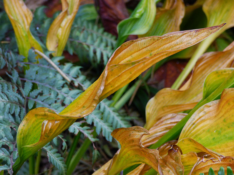 Jesienna 'Praying Hands' niczym strzelające w górę płomienie... na tle niespokojnej toni listowia wietlicy japońskiej (Athyrium niponicum var. pictum) 'Metallicum' i podrzenia żebrowca (Blechnum spicant)... malowniczy obrazek... :kocham zdjęcia z 26.10