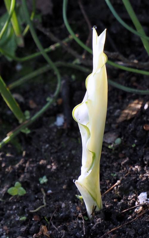 Teraz, wiosną, zachwyca pofalowanymi, śnieżnobiałymi liśćmi z zielonym marginesem.