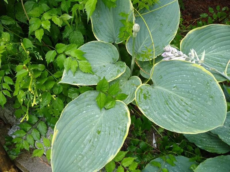 Wielkość G - 120 cm Liście - niebiesko zielone , mocno pofałdowane z żółtym, wąskim brzegiem , pokrój wzniesiony Kwiaty - jasno lawendowe Wzrost - średni Stanowisko - cień ,półcień