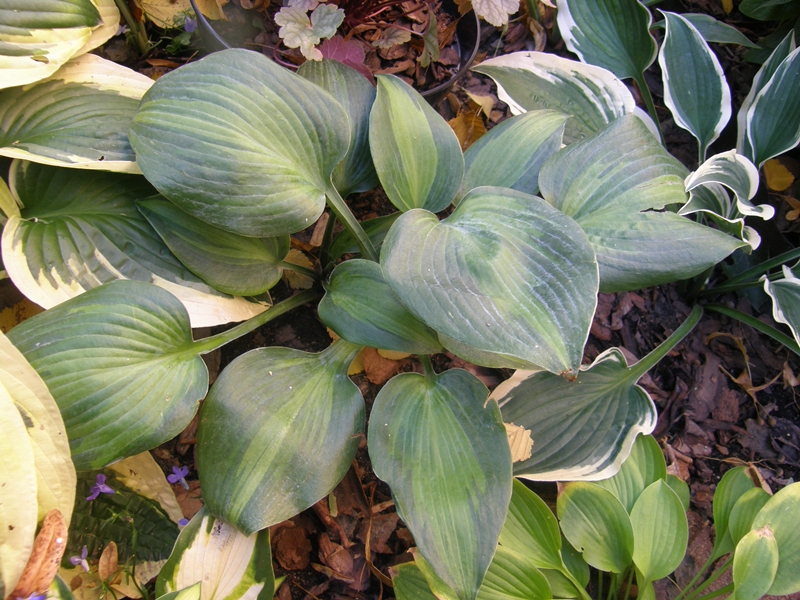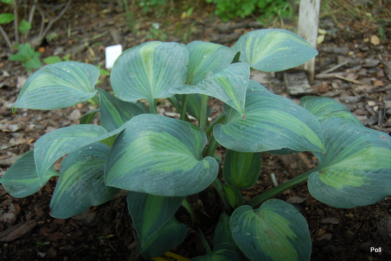 Rozmiar SM wysokość 35-40cm Liście: mocne,podłużne; żółte, wyraźne centrum otoczone niebieskoszmaragdowym ( wiosną - jakby przypudrowanym) marginesem Kwiaty: jasnolawendowe ( k.VII/VII) Zalecane stanowisko: od półcienia