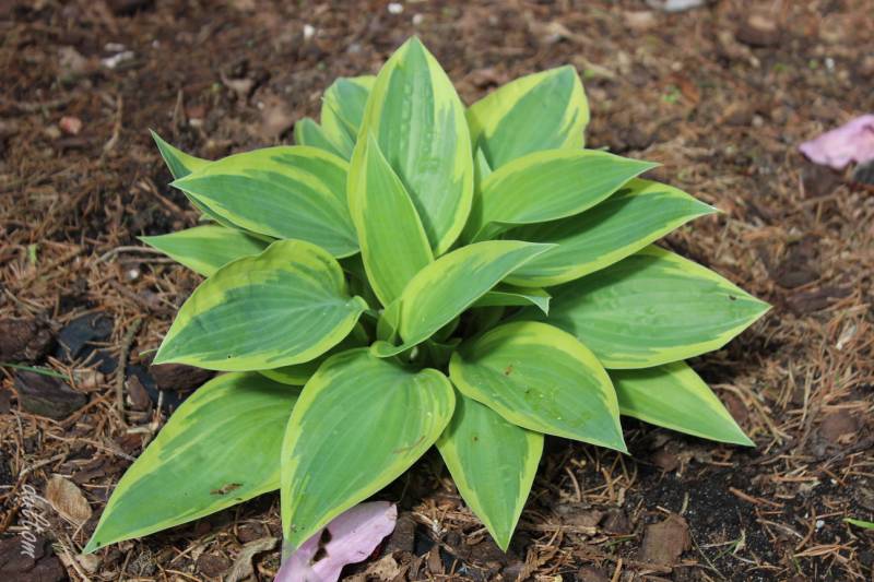 Wysokość: 35-45 cm. Liście: lancetowate, niebiesko-zielone z żółtym brzegiem, jaśniejącym do kremowego, ułożone kaskadowo. Kwiaty: jasne lawendowe, dość liczne. Pojawiają się w sierpniu. Przyrost: szybki, tworzy gęste, rozłożyste kępy o regularnym kształcie. Stanowisko: półcień, cień.