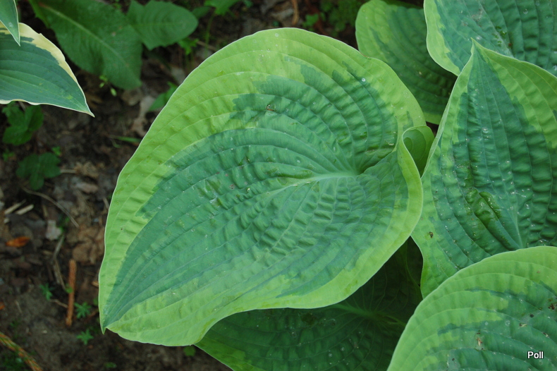 Liście: niemal okrągłe i lekko falujące, duże w porównaniu z wysokością hosty; burchlaste, dobrej substancji; złoty margines otacza zielone centrum