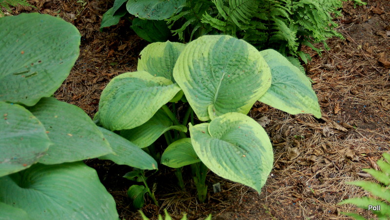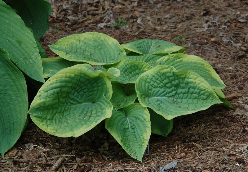 Rozmiar ML wysokość 60cm Liście: niemal okrągłe i lekko falujące, duże w porównaniu z wysokością hosty; burchlaste, dobrej substancji; złoty margines otacza zielone centrum Kwiaty: niemal białe (VI/VII) Zalecane stanowisko: od półcienia