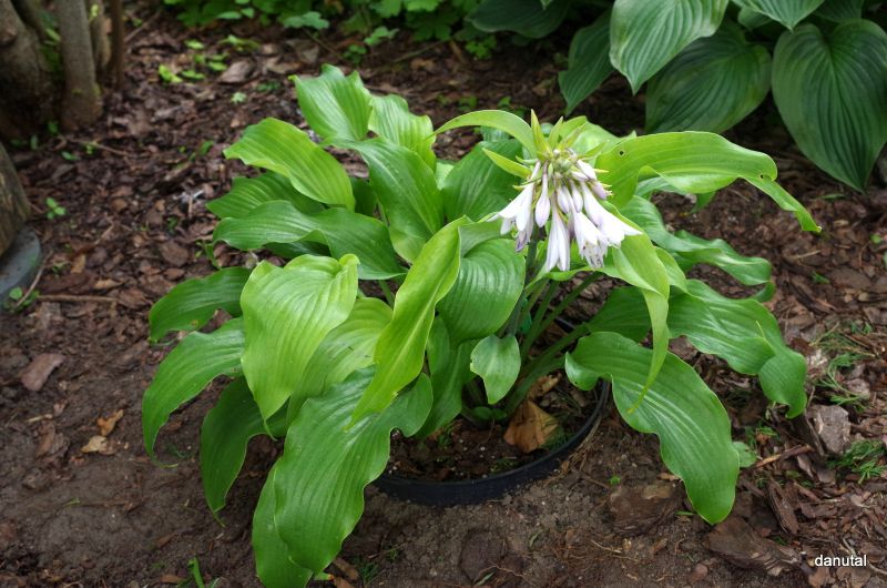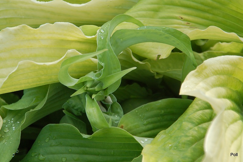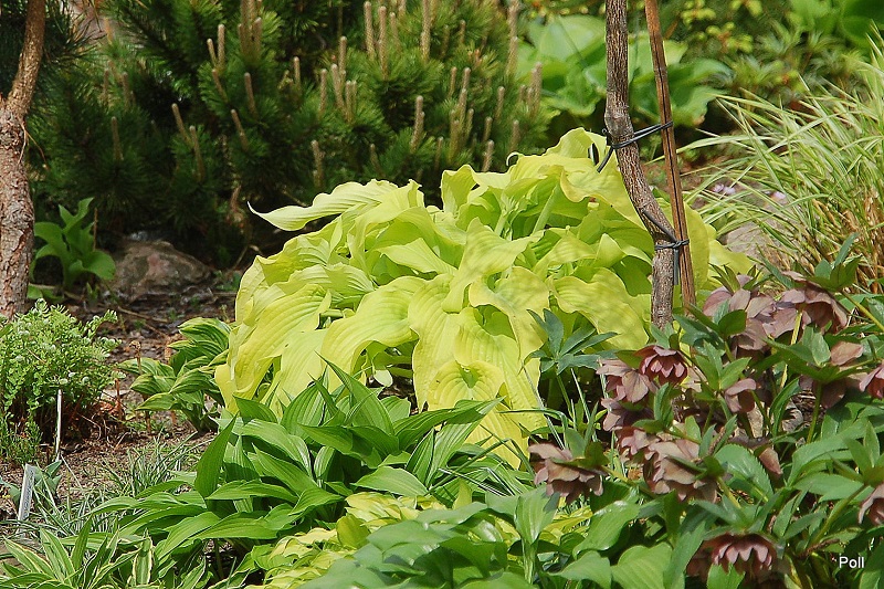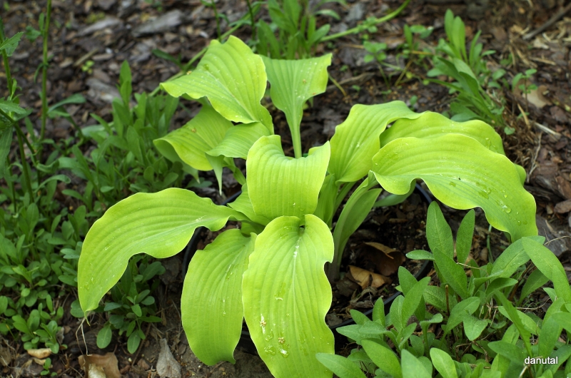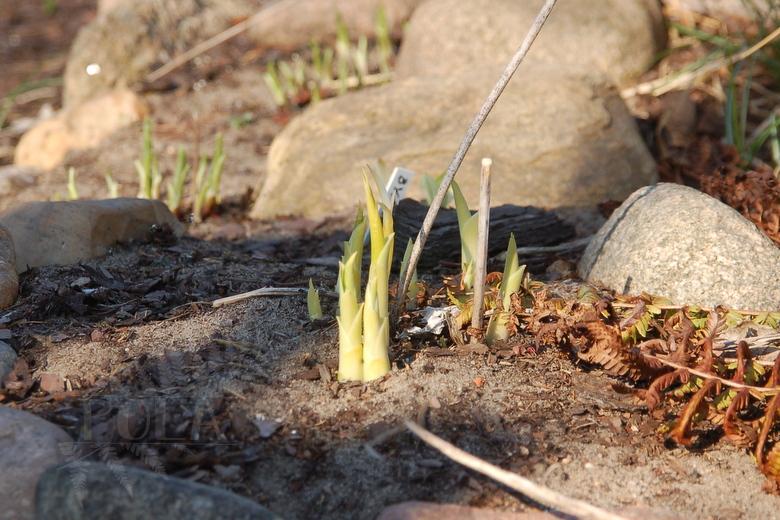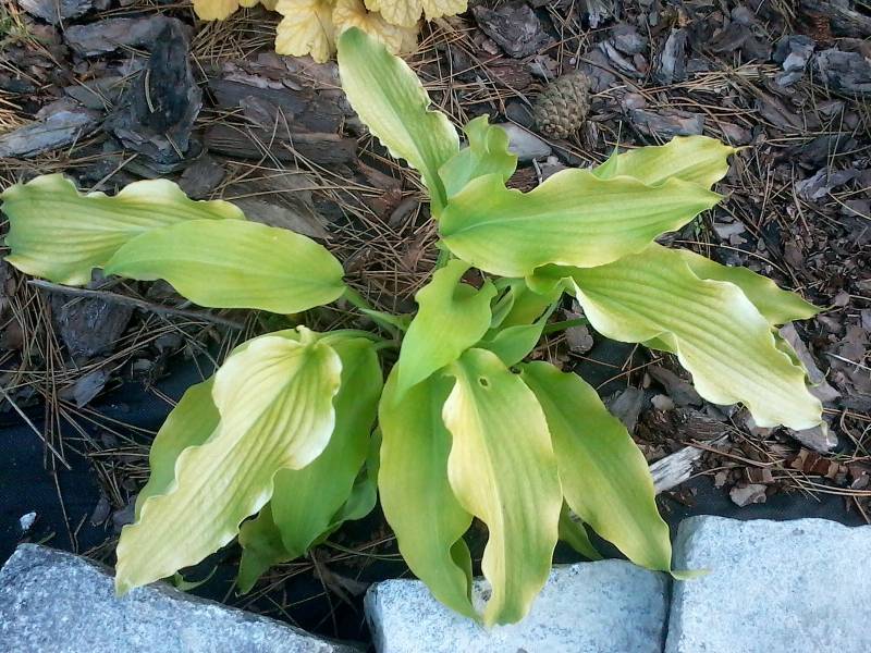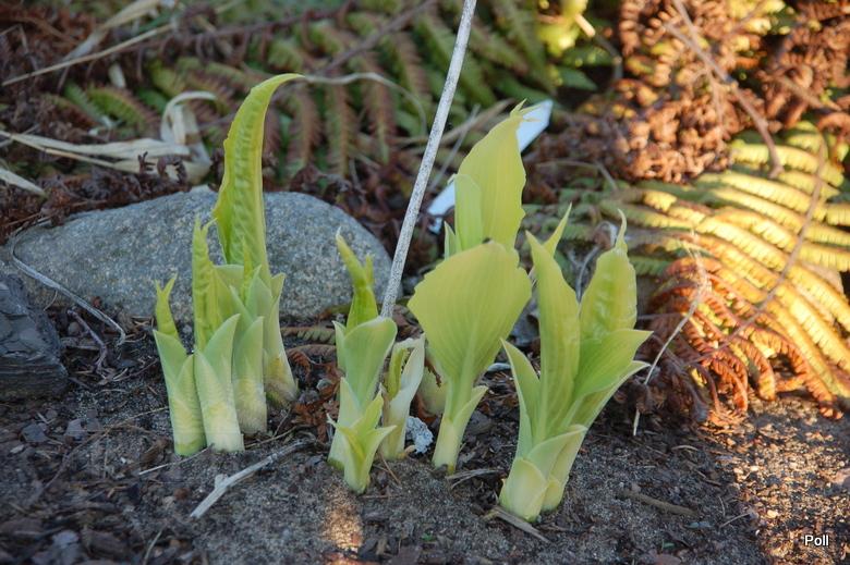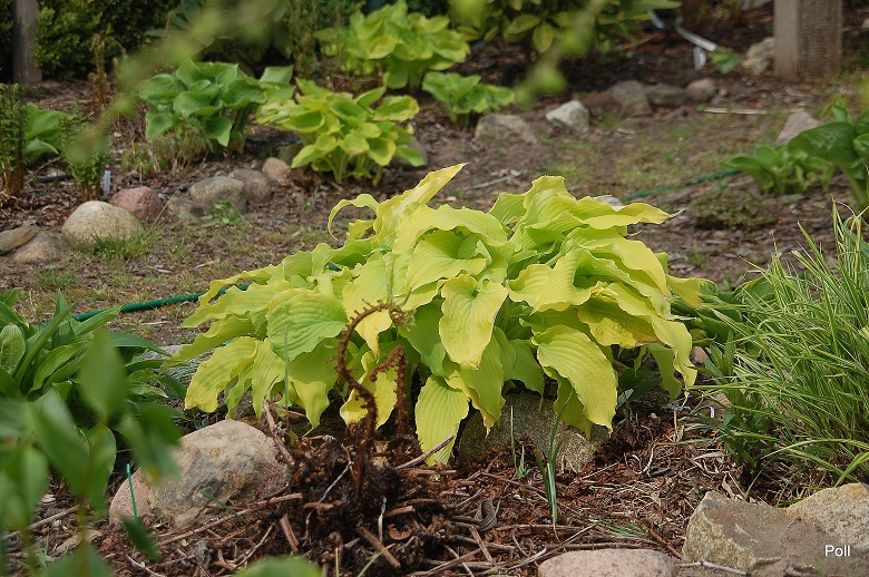 Hosta Lullaby rośnie u mnie w dwóch miejscach, ale przymrozki przetrwała tylko ta, która schowana była za wielkim kamieniem. Wiosną ma ładnego koloru kły i liście - bardzo żółte i ciepłe.
