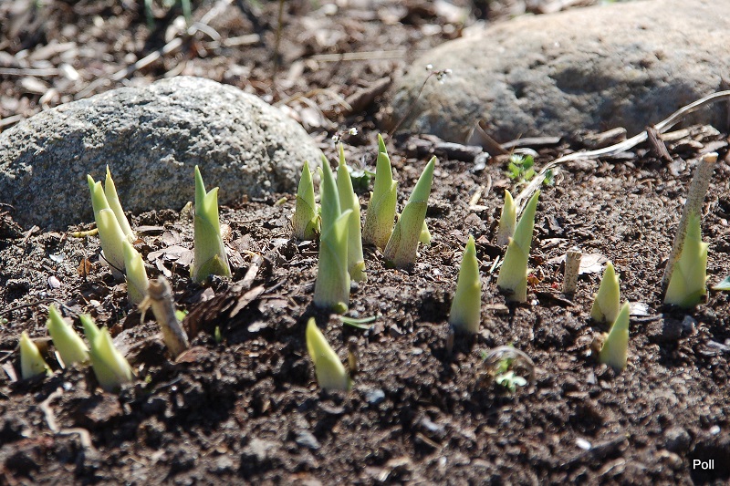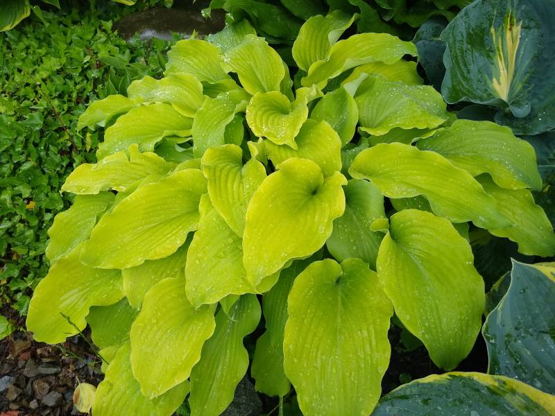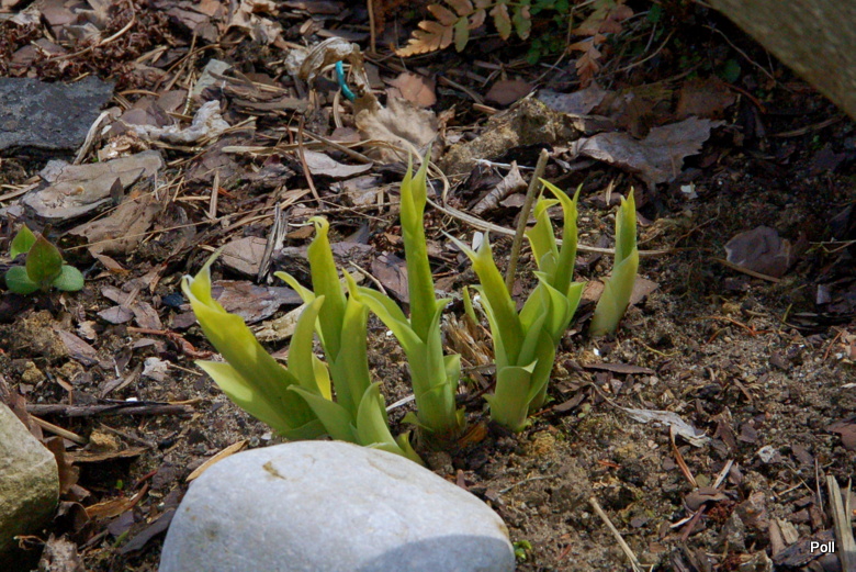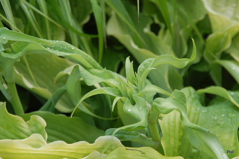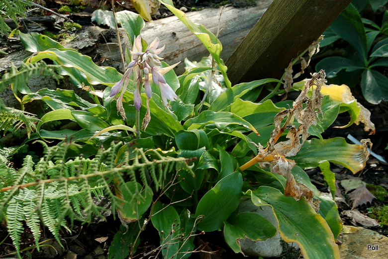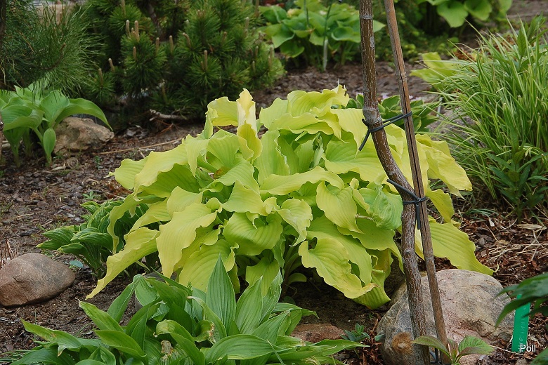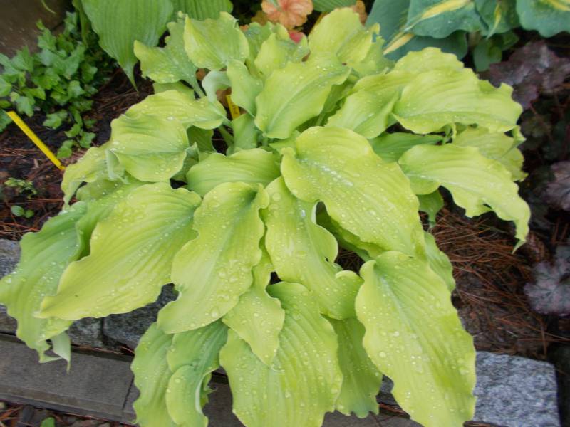Hosta Lullaby rośnie u mnie w dwóch miejscach, ale przymrozki przetrwała tylko ta, która schowana była za wielkim kamieniem. Wiosną ma ładnego koloru kły i liście - bardzo żółte i ciepłe.