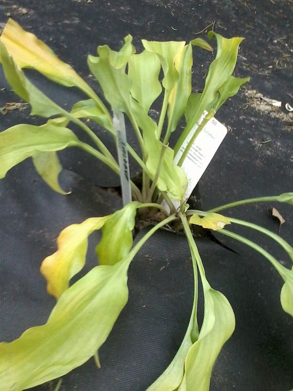 Rozmiar: M wysokość 30cm Liście: wiosną żółte, w trakcie sezonu zieleniejące; podłużne z wykręconymi czubkami; lekko pofalowane brzegi Kwiaty: jasno-lawendowe w sierpniu Zalecane stanowisko: od słońca do cienia Uwagi: