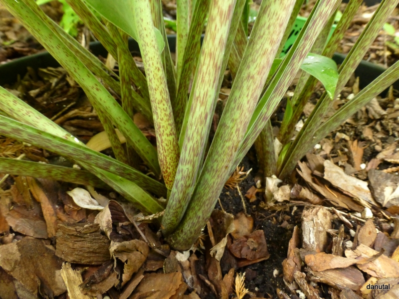 Rozmiar: M (wysokość około 35-40 cm) Liście: ciemnozielone, błyszczące, dobrej substancji o białym spodzie i lekko falujące Kwiaty: lawendowe na czerwono nakrapianych łodygach Zalecane stanowisko: od słońca do cienia