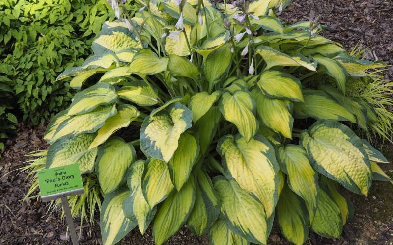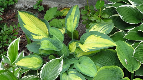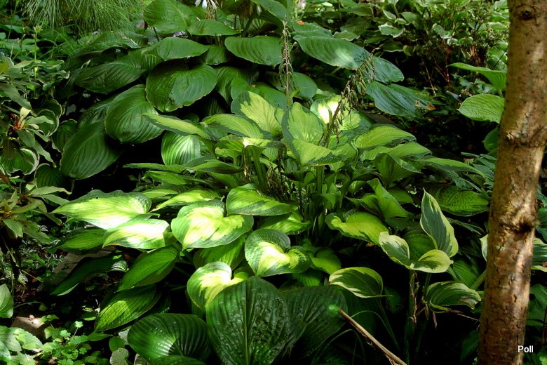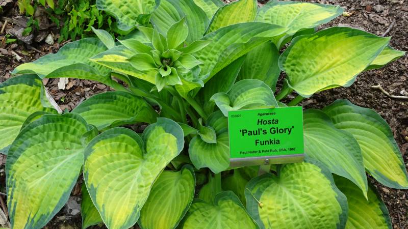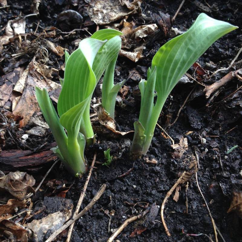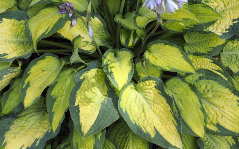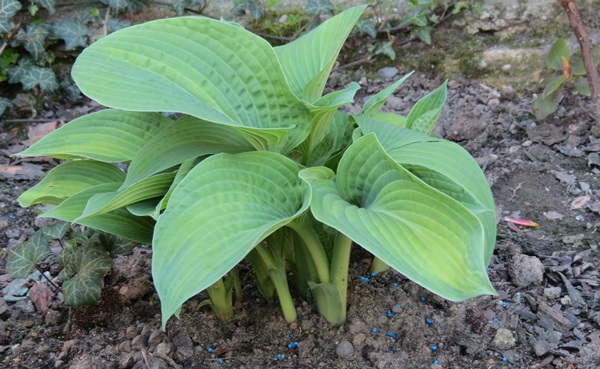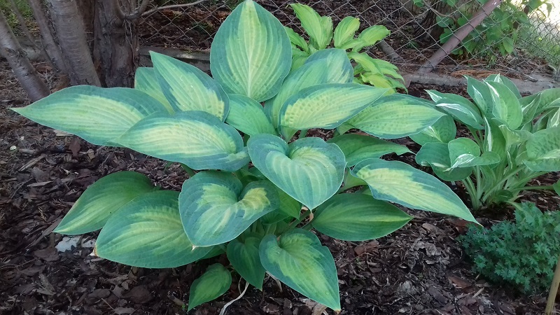 Młode liście mają kolor zielony z niebiesko zielonym marginesem, często w zależności gdzie rośnie ma nieregularne kolory na liściach, jedne są typowe inne mogą być całe zielone, młoda hosta ma liście pofalowane i ma krótsze łodygi,