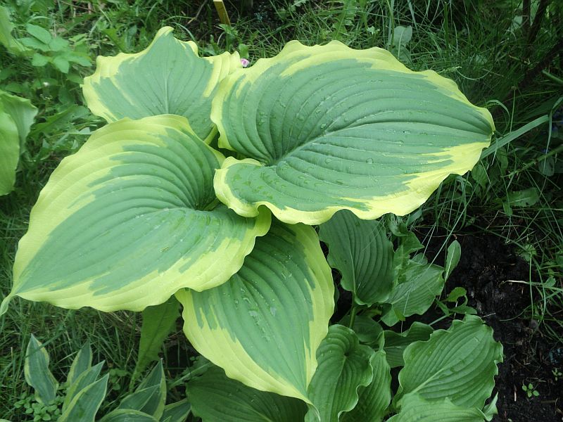 Dodam, że hosta ta rośnie u mnie 5 sezon i zdecydowanie zaliczyłabym ją do rozmiaru L. Stanowisko półcieniste, rośnie na podłożu piaszczysto żwirowym pod szpalerem rozrośniętych cisów. Z podlewaniem bywa... hm... różnie. Wytwarza mało liści z pędu, wiosną miał bodajże 4 kły - 2 pary dość znacznie od siebie oddalone.