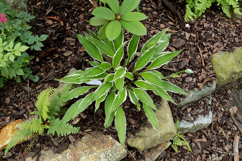3-letnia City Dog, po licznych przejściach, zaczyna znów wyglądać na hostę, choć brakuje jej jeszcze nieco do rozmiaru M. (po lewej, młode Polystichum setiferum 'Madame Patti)
