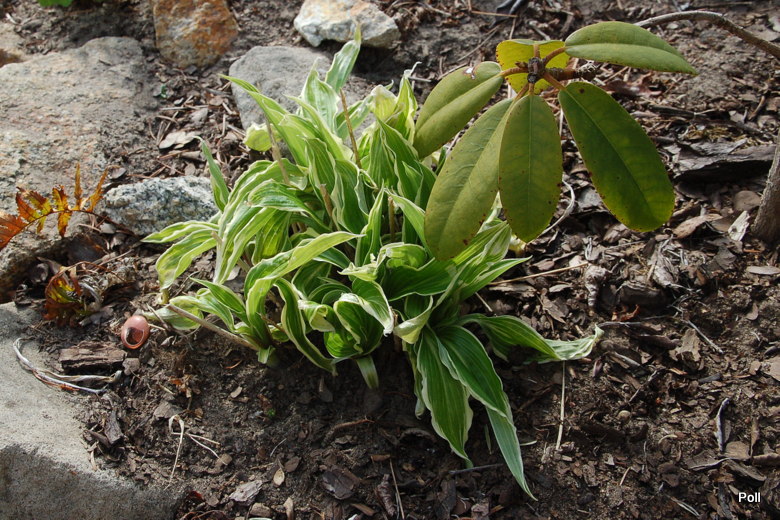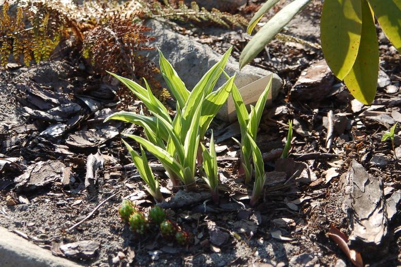Rozmiar: M (osiaga wysokość około 35-40 cm) Liście: wąskie, wydłużone, zielone z mocno falującym białym marginesem, osadzone na czerwono nakrapianych ogonkach liściowych Kwiaty: lawendowe, okres kwitnienia przypada na koniec VII/ początek VIII Zalecane stanowisko: półcień/cień
