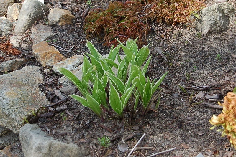 Hosta City Dog już rozwija liście, ale jakimś dziwnym zrządzeniem losu nie została przemrożona, choć rosnąca o metr dalej Valley's Top jest kompletnie zeszklona