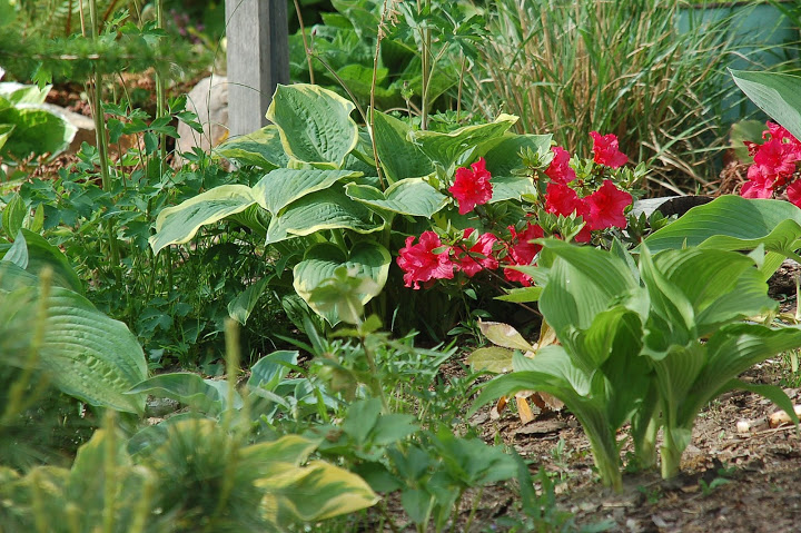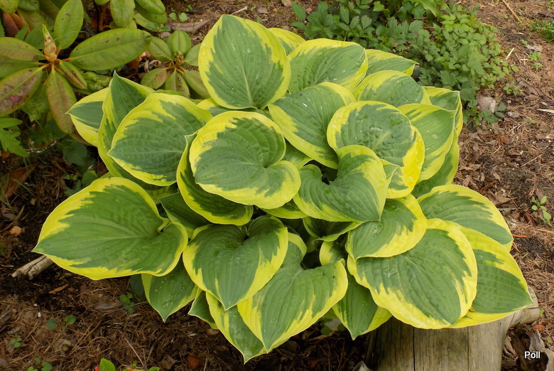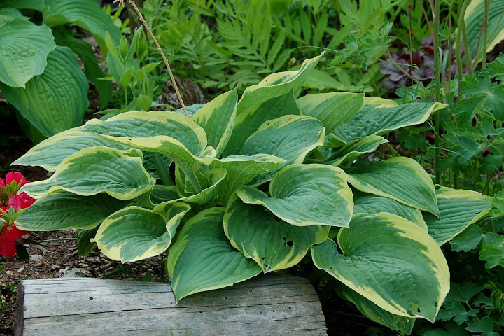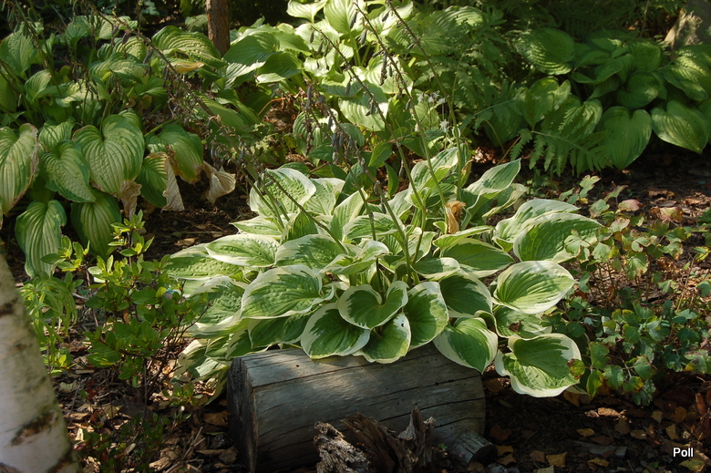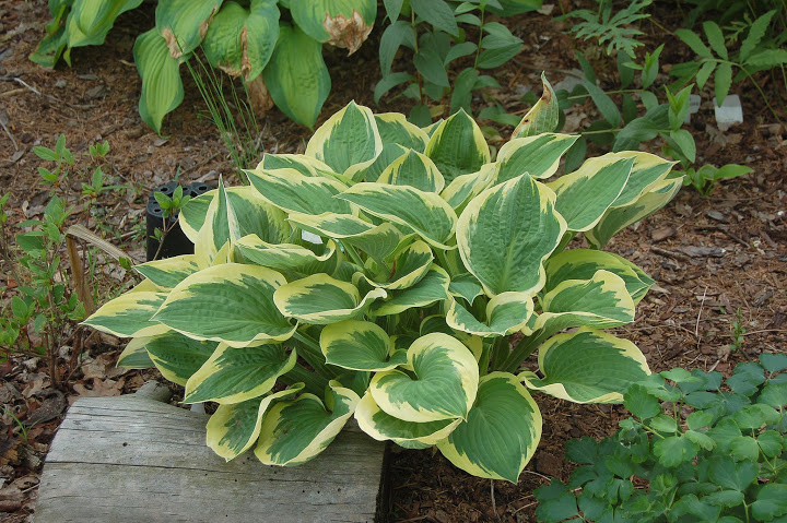 Hosta na zdjęciach ma 4 lata, ale prawdę powiedziawszy, niewiele mogę o niej napisać. Póki co, nie wyróżnia się niczym szczególnym.Wiosną liście mają nieo niebieskawą barwę, potem świetliście jasnozieloną a margines z żółtawego, robi się stopniowo jasniejszy. Na poprzednim stanowisku, które było zbyt słoneczne, margines nie wybarwiał się równomiernie, czego nie znoszę. Przeniosłam więc ją na bardziej cieniste , jak widać prezentuje się lepiej. Jeśli ma pokazać jakieś niezauważone przeze mnie cechy, powinna była to zrobić w ubiegłym roku - był to jej 5ty sezon, więc najwyższy czas. Póki co, odnotowałam ładną symetryczność sercowatych liści, które robią się nieco burchlaste. Jej nazwa "Sea Beacon" oznacza latarnię morską, wskazywałoby to, iż powinna 'świecić' wśród host, przyciągać wzrok kolorem.