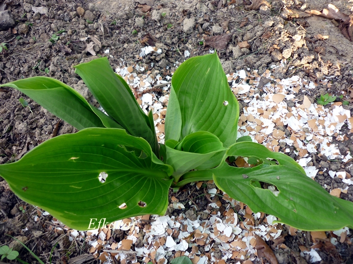Wystarczyła jedna deszczowa noc i ślimaki rozpoczęły swoje dzieło. Zaczęłam się martwić, bo niebieskie granulki rozsypane, a hosta zjedzona... Czyżby były aż tak mądre?
