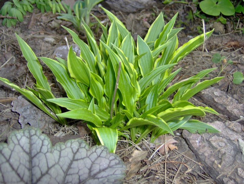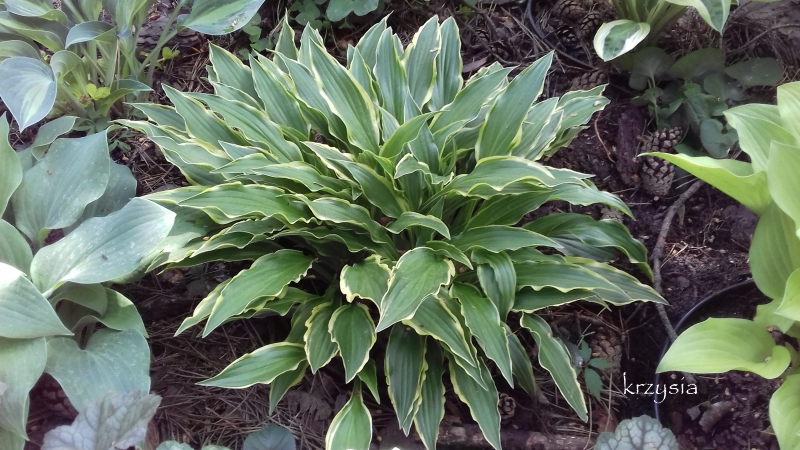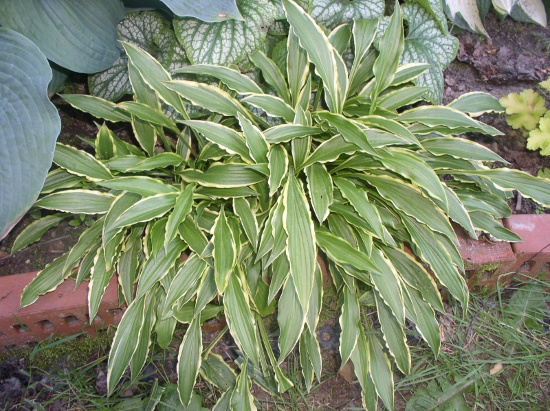 Liście: podłużne, 18 x 2 cm, zielone (zgaszona zieleń) , o żółtym, mocno pofalowanym i nieregularnym marginesie ; z upływem sezonu kolor żółty bieleje