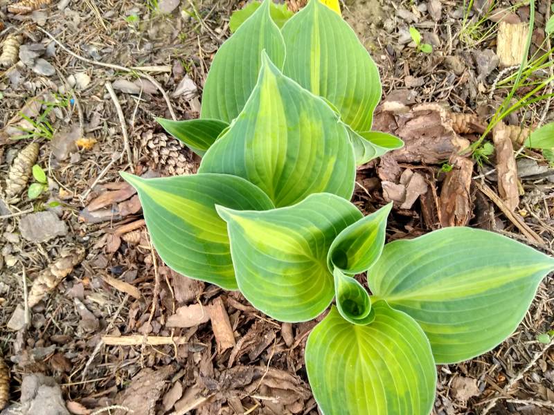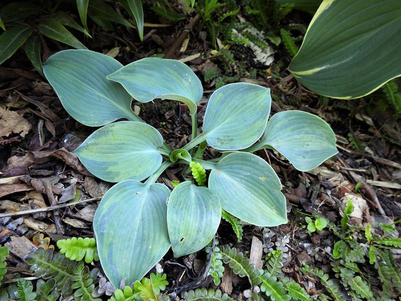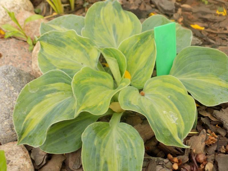 Liście: twarde, okrągłe z ostrym , lekko skręconym czubeczkiem; żółtawo-zielone centrum otoczone nieregularnym, intensywnie niebieskim marginesem, który miejscami spływa aż do centralnego nerwu