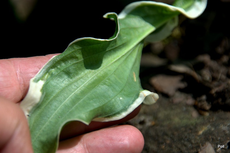 Liście: podłużne ,zielone z białym marginesem , mocno i nieregularnie pofalowane ; back matowy