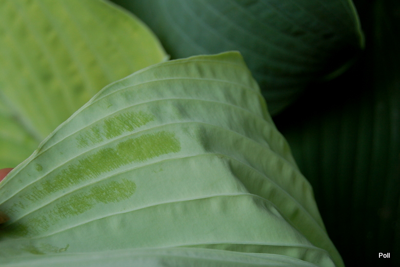 Liśc i jego przymrożony back - nalot ściera się pociągnięty palcem ( w tle, liście hosty River Nile)