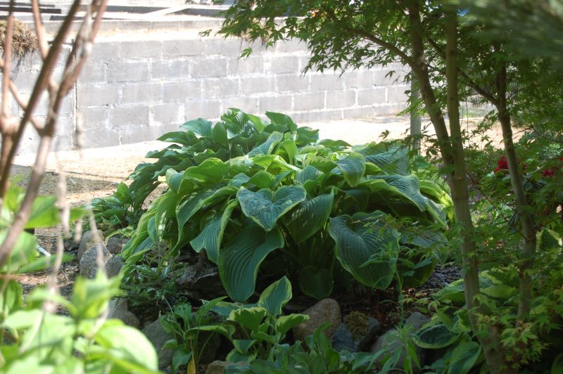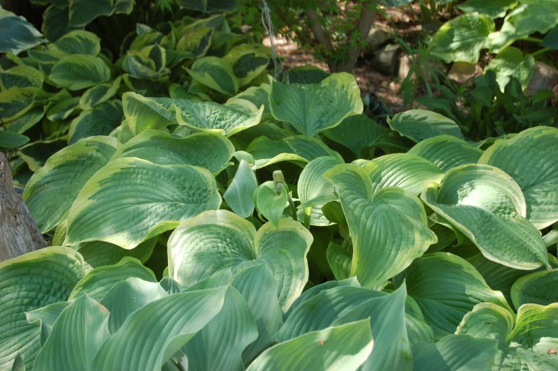 Liście: sztywne, duże (ponad 30 cm długości), sercowate; wiosną niebieskozielone z jasnozielonym , dośc wąskim, ale rozlewającym się w głąb liścia marginesem; w sezonie centrum staje się błyszczace, zielone a brzeg wyżółca się ; dobra substancja z lekkimi burchlami