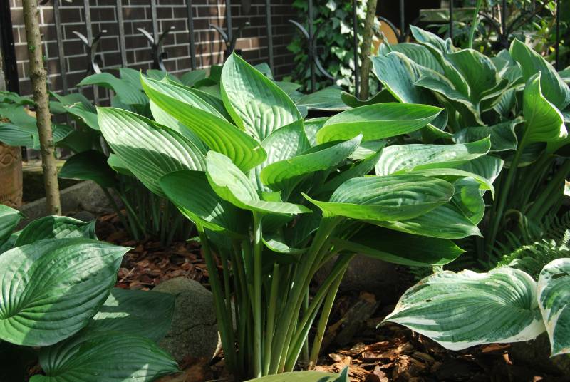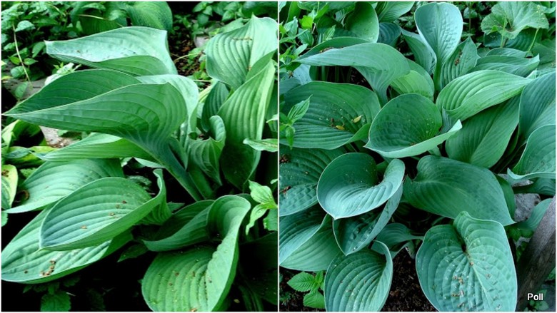 Liście: duże; przypudrowane i niebieskie wiosną, zaś w trakcie sezonu niebieskozielone z białym spodem