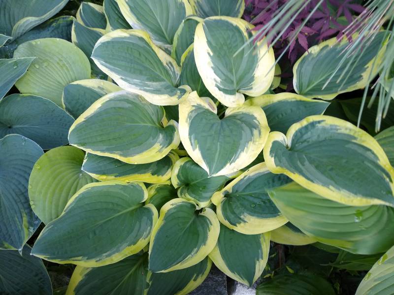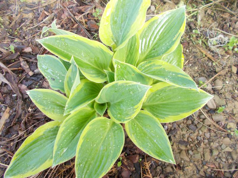 Liście: sercowate , dość ostro zakończone; jasnozielone z szerokim złotym marginesem, który w trakcie sezonu jaśnieje