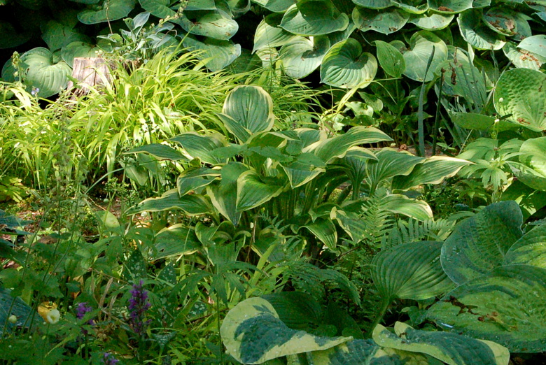 Hosta Bold Ribbons na najstarszym hostowisku, wraz z innymi roślinami cienia